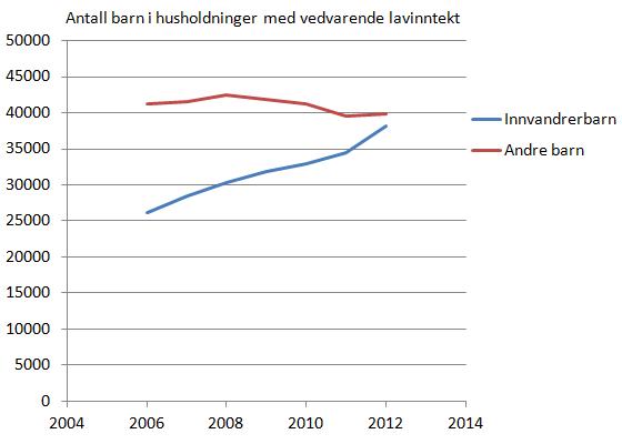 Om man tar utgangspunkt i treårsdefinisjonen, viser tallene for perioden 2006-2012 at antall innvandrerbarn i lavinntektshusholdninger økte fra 26.100 til 38.200 (dvs. med nesten femti prosent), mens tallet for barn uten innvandrerbakgrunn lå noenlunde stabilt rundt 40.000 – i den grad det er noen tendens, er det en liten nedgang.