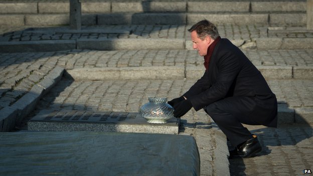 Walking along the rail tracks to a memorial by the woods where victims of the Holocaust were burnt and buried, Mr Cameron presented a candle to honour their memory.