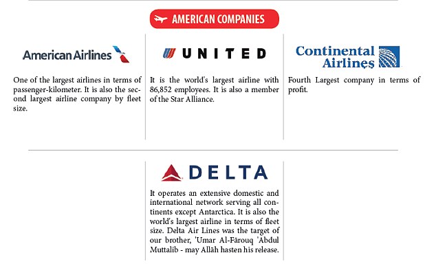 Also targeted in the publication, which is called Inspire and has already been widely reported by news outlets around the world, are Air France and U.S. carriers American Airlines, United and Delta alongside high-profile U.S. figures Bill Gates and Federal Reserve chairman Ben Bernanke.