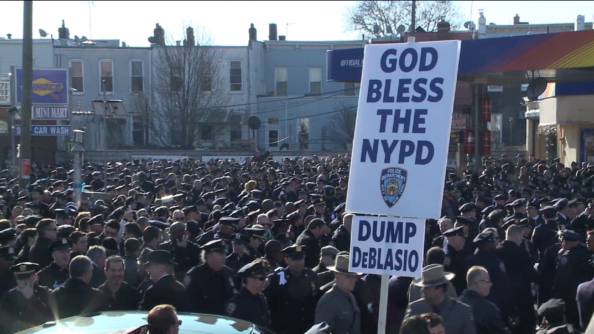 Akkurat som ved pressekonferansen etter drapene på de to politimennene, valgte hundrevis av politibetjenter å vise ordfører De Blasio ryggen under hans tale i begravelsen. Drapet på Rafael Ramos og Wenjian Liu var en hevnaksjon utført av Ismaaiyl Abdullah Brinsley.