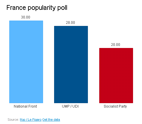 Marine Le Pen og Front National har i Le Figaros siste meningsmåling fått 30 % oppslutning. Med dette resultatet vil Front National bli Frankrikes største parti.