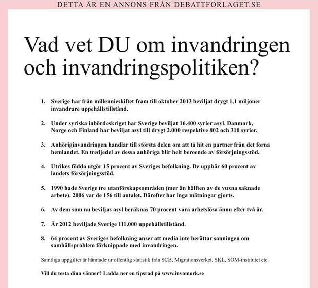«Dagens Nyheter publicerade en annons med rasistiska myter om innvandring», tordnet skribenten Tanvir Mansur i et innlegg på SVTs nettutgave.