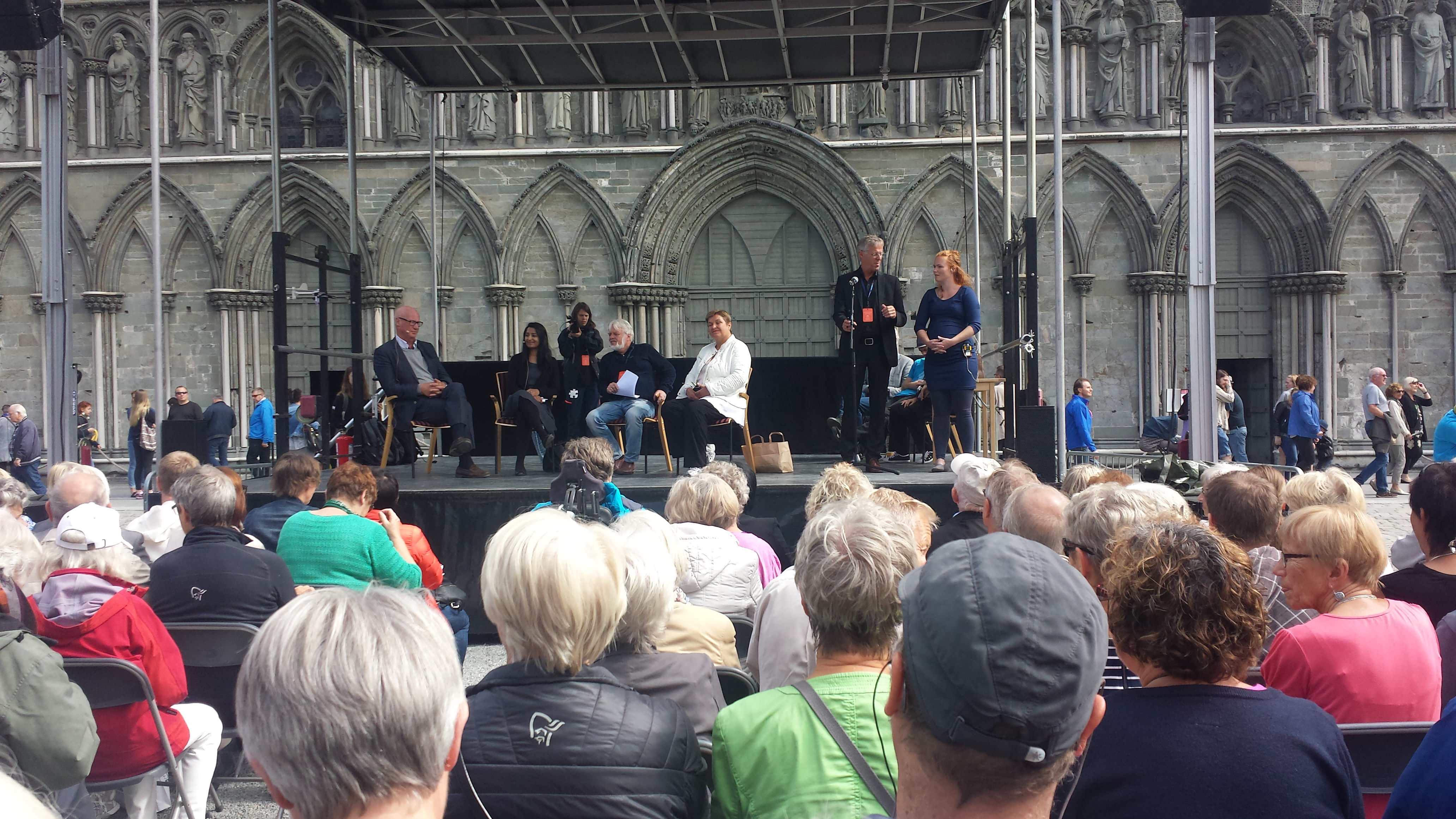 Solen varmet og folk strømmet til plassen ved Nidarosdomens vestfront tirsdag for å høre NRK-journalist Tomm Kristiansen lede samtalen rundt temaet «Midtøsten – verdens knute, om politisk kristendom, politisk jødedom og politisk islam». Kristiansen startet med en lovnad: Vi har ikke tenkt å gå utenom noen konfliktsider av dette. På scenen var Trond Bakkevig, Anne Sender og Bushra Ishaq, og døvetolkene som tolket hele møtet – et flott initiativ.