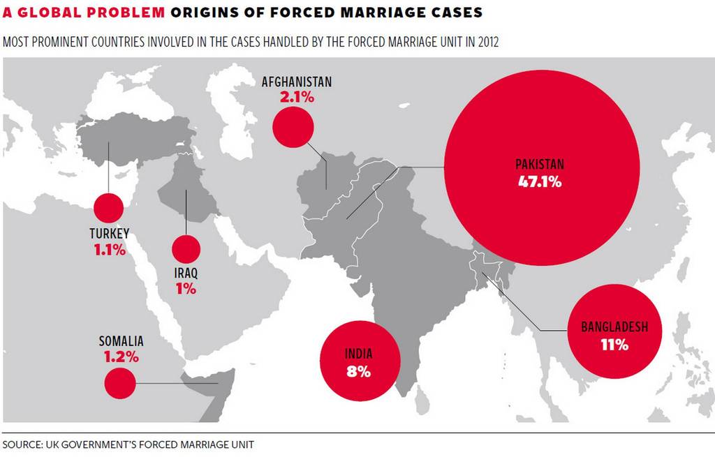 Også i Storbritannia ser man at storparten av tvangsekteskapene har pakistansk bakgrunn. The Independent