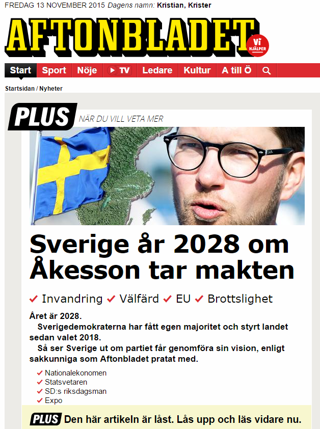 Men vil du vite hvordan Sverige blir i fremtiden med Sverigedemokraterna i ledelsen, ja da vil Aftonbladet ha betalt for det: