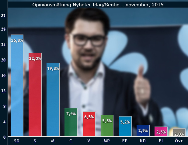 Nyheter Idag/Sentio serverer det høyeste resultatet for SD noensinne i en meningsmåling: 26,8 prosent.