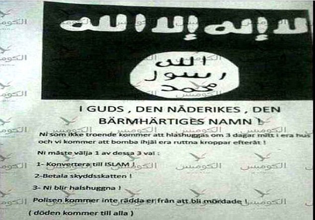 The notes, which are signed ISIS and carry the terrorist organisation’s flag, threaten to decapitate ‘non-believers’ unless they become a Muslim or pay a religious tax.