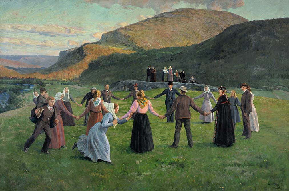 Den utvungne omgangen mellom kjønnene er bemerkelsesverdig. Stadig hører vi at Norge i gamle dager minnet om dagens hijab og at man dekket til og skjulte. Det er tøvete. Så den glade dansen på bildet. Det er St. Hans over Norge.