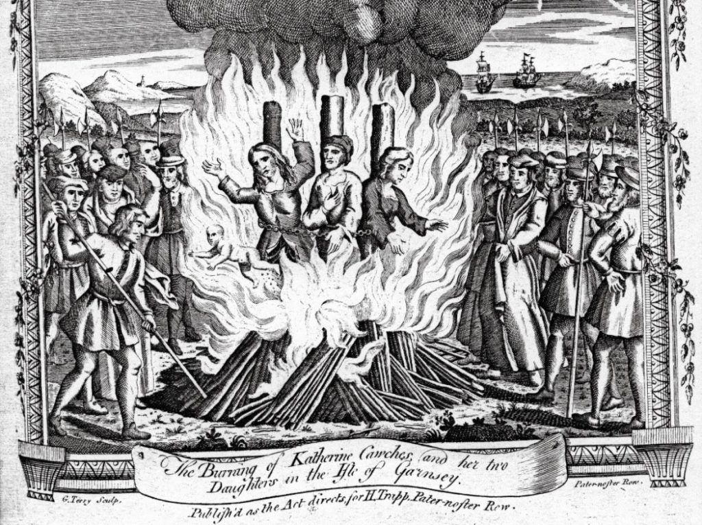 The Guernsey Martyrs were 3 women who were burned at the stake for their Protestant beliefs, in Guernsey, Channel Islands, in 1556 during the Marian persecutions. Guillemine Gilbert & Perotine Massey were sisters, who lived with their mother, Catherine Cauchés (sometimes given as «Katherine Cawches»). Perotine was the wife of a Norman Calvinist minister, who was in London, possibly to avoid persecution. The 3 women were brought to court on a charge of receiving a stolen goblet. Although they were found to be not guilty of that charge, it emerged that their religious views were contrary to those required by the church authorities. They were returned to prison in Castle Cornet & later found guilty of heresy by an Ecclesiastical court & condemned to death. The execution was carried out on or around 18 July 1556. All 3 were burnt on the same fire; they ought to have been strangled beforehand, but the rope broke before they died & they were thrown into the fire alive. John Foxe recorded that Perotine was «great with child» & that «the belly of the woman burst asunder by the vehemence of the flame, the infant, being a fair man-child, fell into the fire.» The baby was rescued, but the Bailiff, Hellier Gosselin, ordered that «it should be carried back again, & cast into the fire»