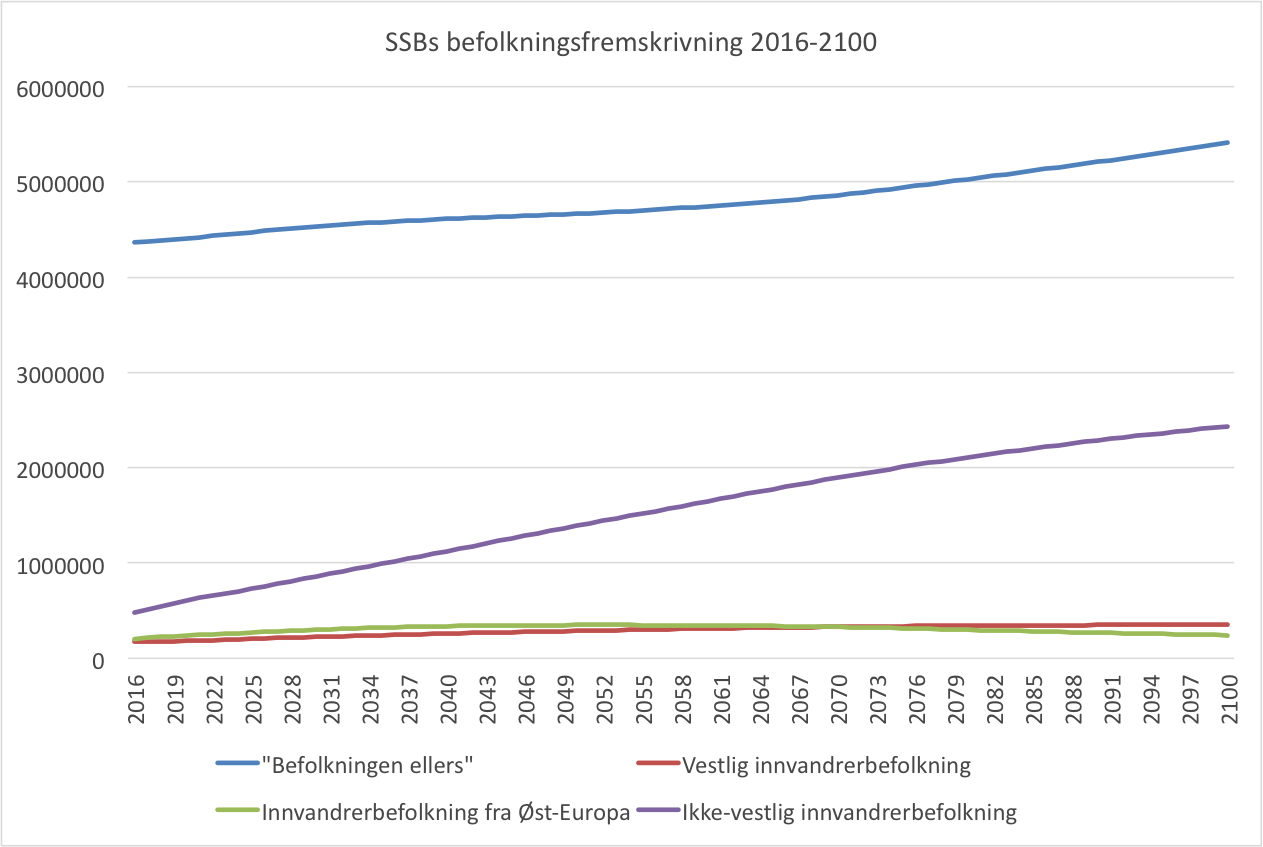Den viktigste endringen er altså at den ikke-vestlige innvandrerbefolkningens 1. og 2. generasjon øker fra ca. en halv million i dag til to og en halv million mot slutten av århundret, mens den østeuropeiske og vestlige innvandrerbefolkningen forblir omtrent på samme nivå. Det SSB kaller «befolkningen ellers», øker langsomt til midten av århundret, for deretter å øke noe raskere.