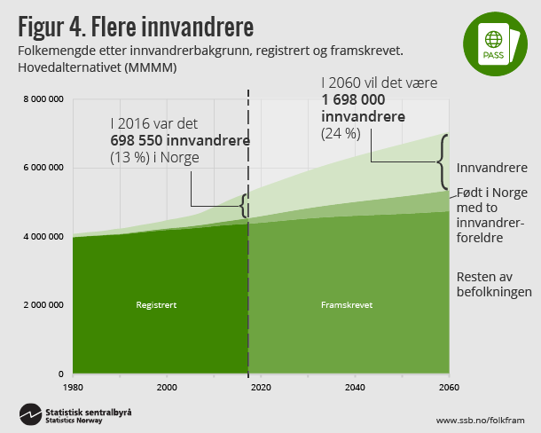 Tallet på innvandrere vil dobles fra 700.000 i dag til 1,4 millioner i 2040, ifølge SSBs hovedalternativ. I 2060 vil antall innvandrere være 1,7 millioner, ifølge hovedalternativet.