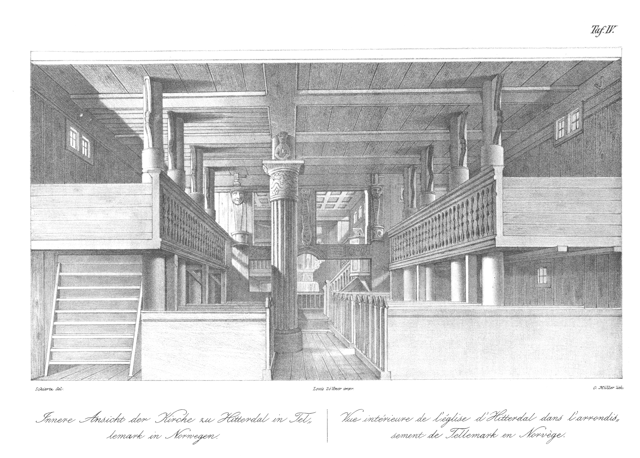 Det dreier seg om litografiske trykk etter Dahls tegninger. Dahl dokumenterte i alt tre norske stavkirker, Borgund (Lærdal, Sogn og Fjordane), Urnes (Luster, Sogn og Fjordane) og Hitterdal (Heddal, Telemark). Han gjenga grunnriss og eksteriør av alle tre, dessuten noen arkitektoniske detaljer, men bare interiør fra Urnes og Hitterdal.
