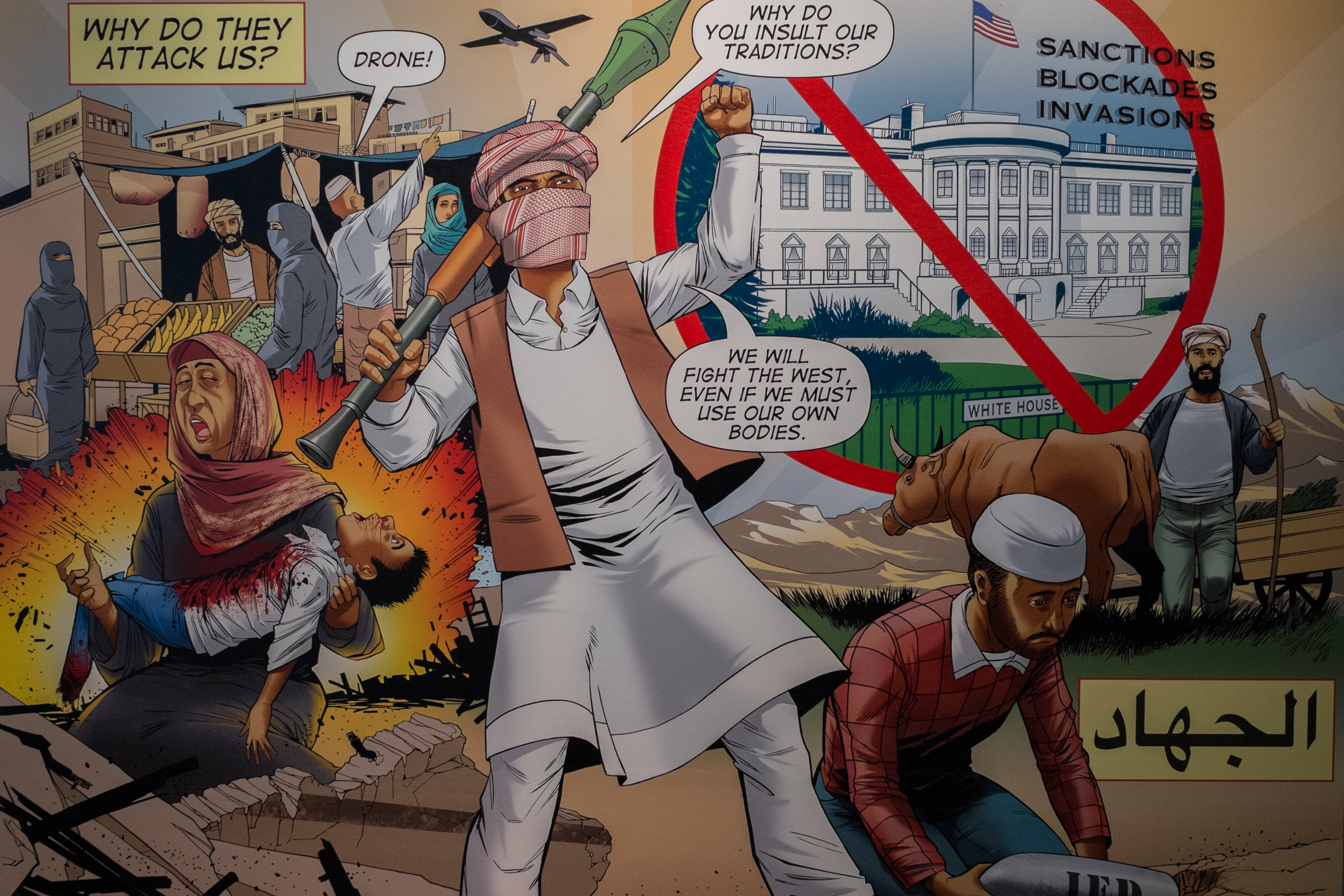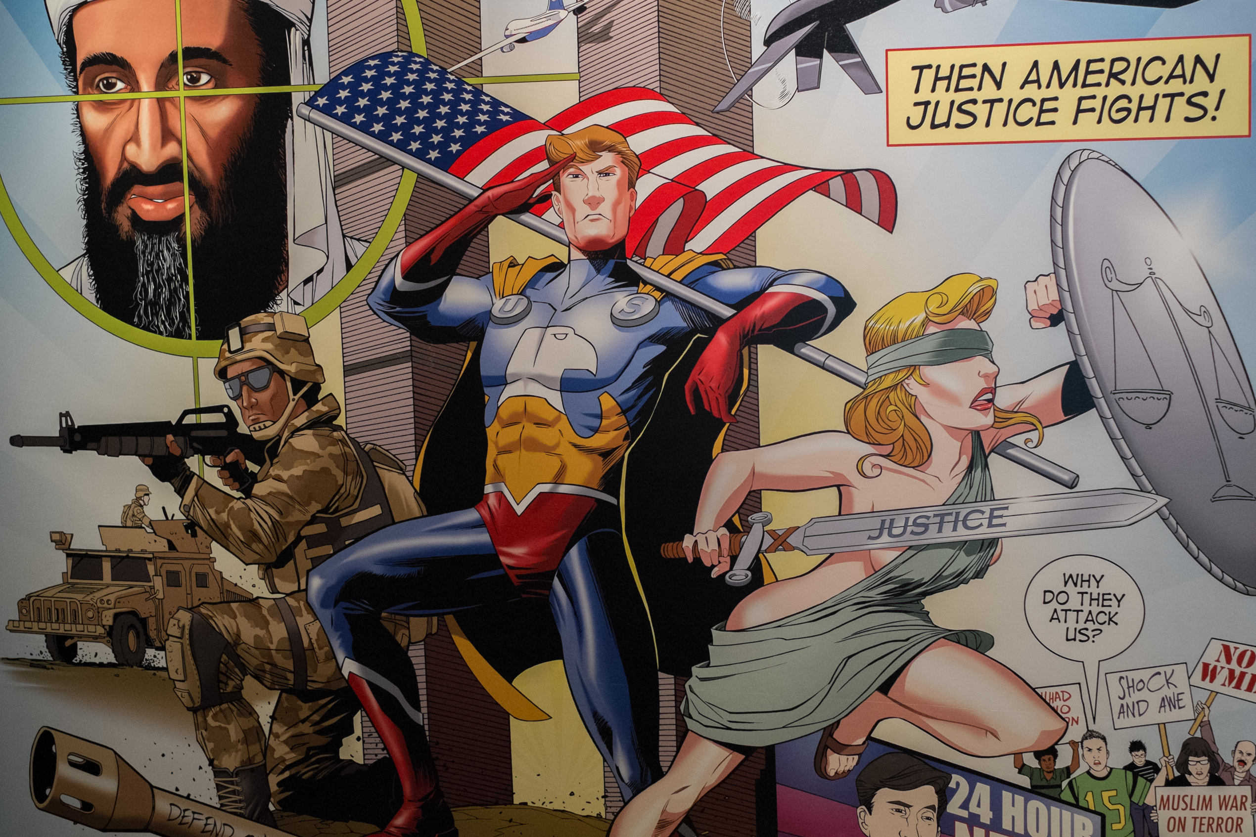 En nasjonalistisk superhelt flankert av henholdsvis en aggressiv, blind, halvnaken kvinne med silikonpupper og moderne våpen. På den andre plakaten finner du naturlig fredelige, men fortvilte muslimer som blir angrepet, og som derfor ikke har annen utvei enn å forsvare seg med vold. VG-kommentatorens dannelsesideal eller bare en tåpelig karikatur?