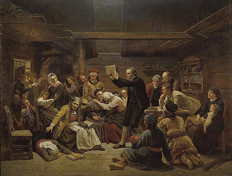 Adolph Tidemand er mester for noen av de mest kjente og avholdte bildene i norsk kunsthistorie på 1800-tallet, Brudeferd i Hardanger (i samarbeid med Hans Gude), De ensomme gamle, og ikke minst Haugianerne. Hans Fanatikerne kan sees som et motstykke til Haugianerne, der alt foregår i rolige former. Tidemand har inkludert samer blant møtedeltagerne, og dette antyder at møtet finner sted i et nordnorsk område, og at vi har å gjøre med læstadianere. Et interessant poeng er at predikanten ser ut til å ha slått opp omtrent midt i sin bibel – men da jeg selv forsøkte å slå opp omtrent midt i bibelen, fant jeg det 11. kapitel hos profeten Esaias, hvor det blant annet står skrevet: