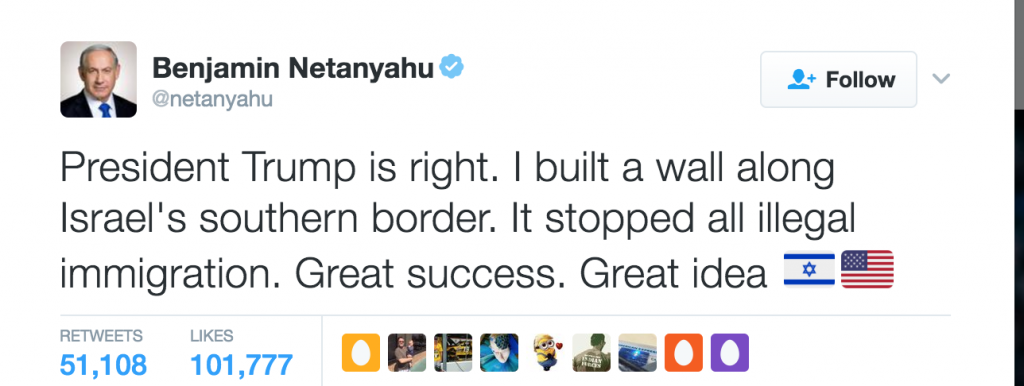 Benjamin Netanyahu twitrer at han støtter Donald Trumps vedtak om å bygge en mur mot Mexico. Netanyahu viser til sikkerhetsgjerdet Israel har bygget. Det stanser både terrorister og migranter. Israel under Netanyahu er ved å bli Trumps viktigste allierte. Theresa May kan snakke om special relationship, men når det kommer til stykket distanserer hun seg […]