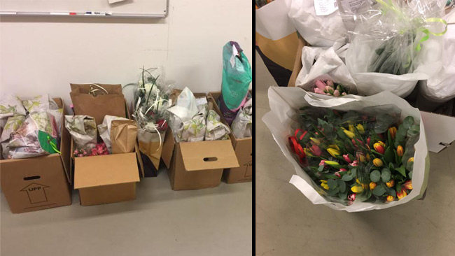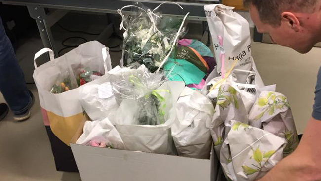 Men farlige blomsterbilder har lekket ut! I starten holdt resepsjonen styr på bukettene, men da det ble fullt der tok en annen avdeling over. Det hadde da kommet et 60-tall buketter – pluss diverse pakker og konfekt.