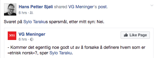 Det VG sier, uten å si det rett ut, ved å gi Taraku spalteplass til disse ugeniale betraktningene, er at folk som er opptatt av etnisitet, er å sammenligne med nazistene.