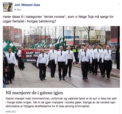 I diskusjonen under blånekter Wessel-Aas for at han kaller Toje nazist, men får naturligvis pepper for assosiasjonen. Hovedsaken er at den skitne jobben er gjort. Brunbeis én for å oppdra hundre.