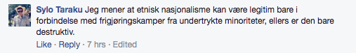 Den logiske følgen av Tarakus tese er at det ikke er legitimt av Toje å snakke om etnisitet på den måten han gjør. En kosovo-albaner forteller med andre ord en nordmann at denne ikke har lov til å snakke om sitt eget folkeslag. Man skal altså ikke si noe som er en selvfølge for de aller fleste mennesker.