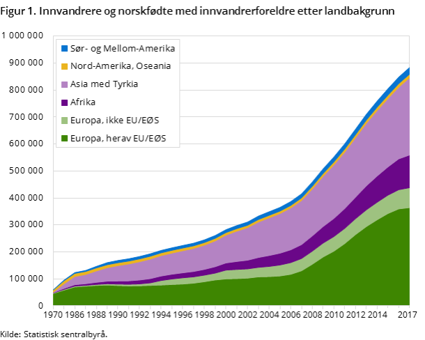 Blant de til sammen 884.000 personene i Norge med innvandrerbakgrunn har 46 prosent i bakgrunn fra land i Asia og Afrika. 43 prosent er fra EU og EØS-området og andre vestlige land.