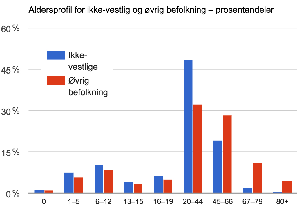 En umiddelbar observasjon er at de ikke-vestlige utgjør godt over ti prosent sammenlignet med resten for samtlige aldersgrupper opp til 44 år, og godt under for de eldste gruppene. Det er altså blant de yngre vi finner hovedtyngden av de ikke-vestlige. Det er tale om helt forskjellige spredninger over aldersspekteret: