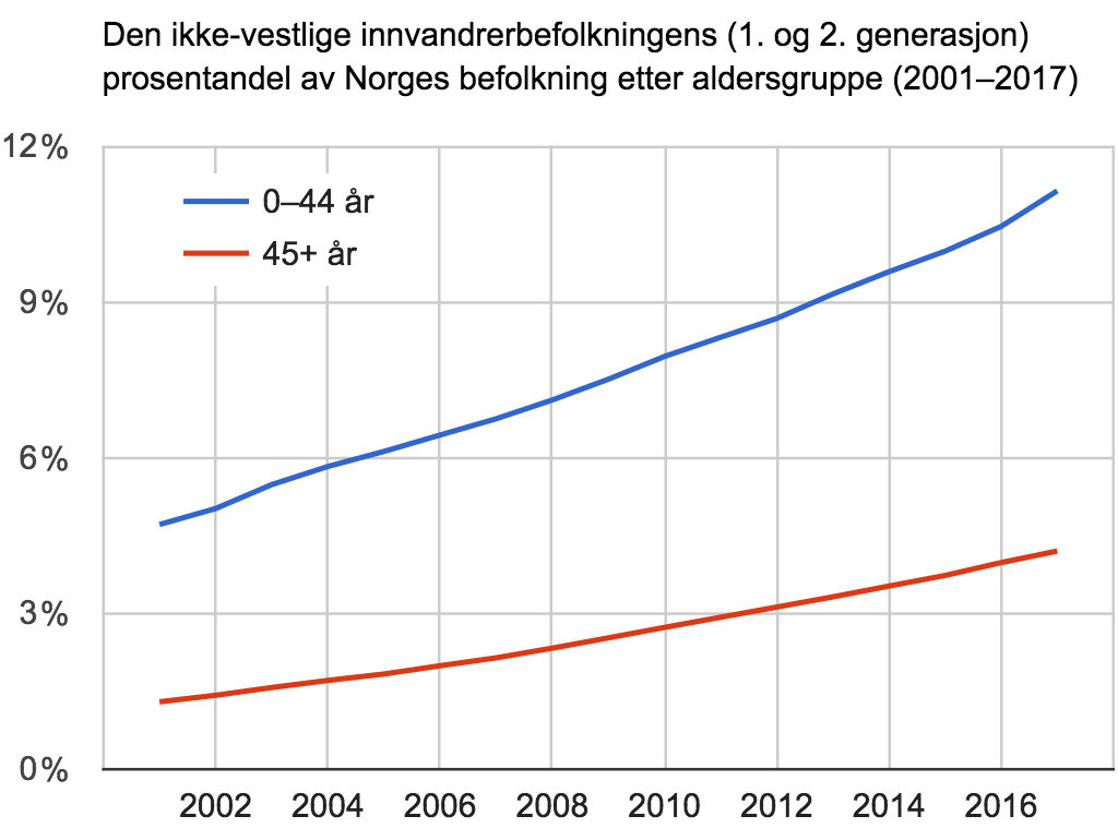 Vi observerer en jevnt stigende prosentandel av ikke-vestlige, for tiden svakt eksponentielt økende. For den yngre delen av befolkningen utgjør ikke-vestlige 1. og 2. generasjonsinnvandrere nå ca. 11,2 % av totalen, eller nokså nøyaktig én av ni personer – en andel som i fravær av kraftige politiske tiltak vil fortsette å stige. I 2001 var den til sammenligning på 4,7 %, eller litt over det andelen er for den eldre delen av befolkningen i dag.