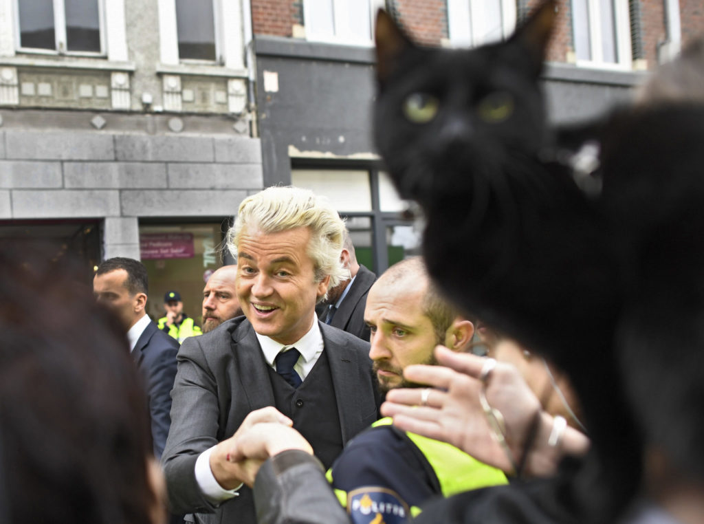 Geert Wilders på valgkampanje blant folk og katter i Heerlan, Nederland, 11. mars. (Foto: Reuters/Dylan Martinez)