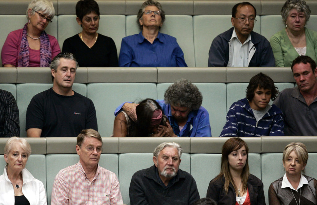 Bildet: Året er 2008 og stedet er parlamentet i Canberra.  Statsministser Kevin Rudd ber aboriginerne om unnskyldning på vegne av nasjonen for at myndighetene tok barna fra dem for å gjøre dem australske. Et aboriginer-par bryter sammen. Foto: Andrew Sheargold/Reuters/Scanpix.