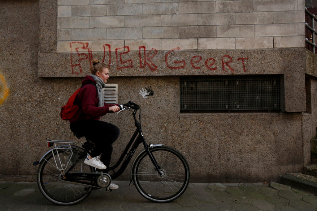 Bildet: En ung dame sykler forbi en jødisk skole i Amsterdam med påskriften Fuck Geert. Foto: Cris Toala Olivares/Reuters/Scanpix.