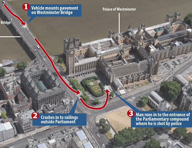 Ved 15.30-tiden norsk tid kjørte en angriper en firehjulsdrevet grå Hyundai SUV over Westminster-broen og meide ned flere fotgjengere. Han krasjet bilen inn i et gjerde som omkranser parlamentet før han forlot den, løp mot politibetjentene ved parlamentet og knivstakk en av dem innenfor en av portene til det britiske parlamentet.