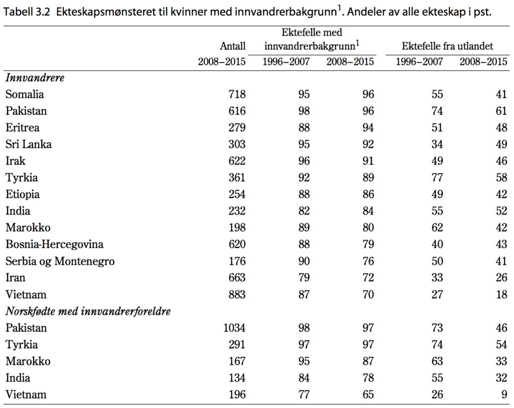 Tilstrømningen er så massiv at innvandrerbefolkningen etterhvert danner det som på fagspråket kalles diasporaer, altså etnisk baserte parallellsamfunn, som får stadig vanskeligere for å tilegne seg en norsk samfunnsmodell. Regjeringen legger frem statistikk som illustrerer denne vanskeligheten på en overbevisende måte, ikke minst denne tabellen på side 56, som inneholder tall for ekteskapsmønsteret blant ikke-vestlige innvandrere både i første og andre generasjon: