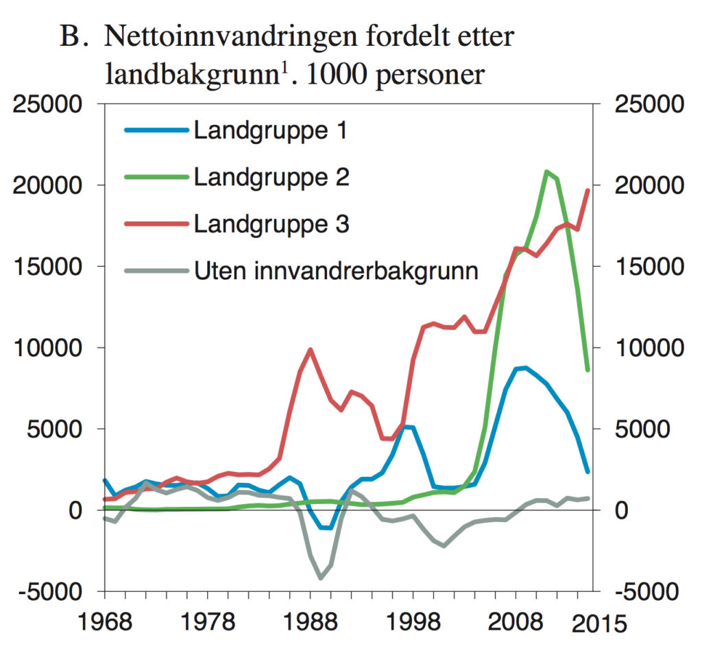Til tross for at arbeidsinnvandringen fra landgruppene 1 (vestlige land) og 2 (øst-europeiske EU-land) er gått ned de senere årene, har migrasjonen fra landgruppe 3 (ikke-vestlige land) økt ufortrødent. En figur på side 54 i perspektivmeldingen illustrerer utviklingen: