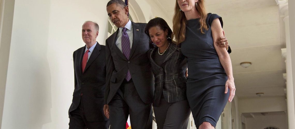 Fra venstre daværende nasjonal sikkerhetsrådgiver Tom Donilon, FN-ambassadør Susan Rice og Samantha Power som skulle etterfølge henne i FN.