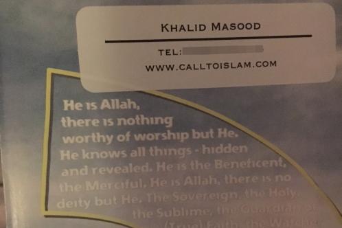 Masood’s name, a phone number that The Sunday Times has confirmed as his, and the calltoislam.com web address appear on stickers attached to leaflets on display at the mosque. One of the leaflets was picked up from the mosque’s lobby by a reporter for this paper.