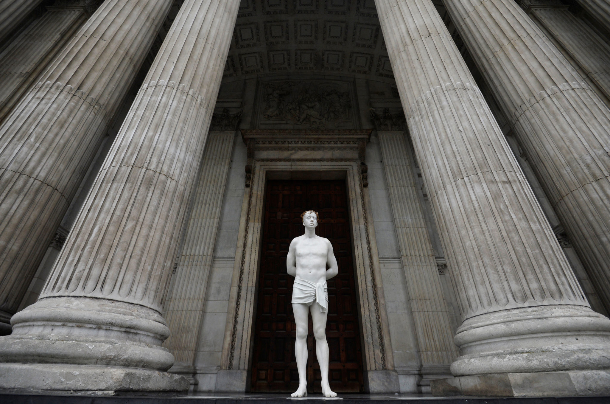 Bilde: Den britiske kunstneren Mark Wallinger har laget skulpturen «Ecce Homo» («Se dette mennesket»), plassert mellom søylene på St. Paul-katedralen i London. Bildet er tatt 12. april av Hannah McKay/Reuters/