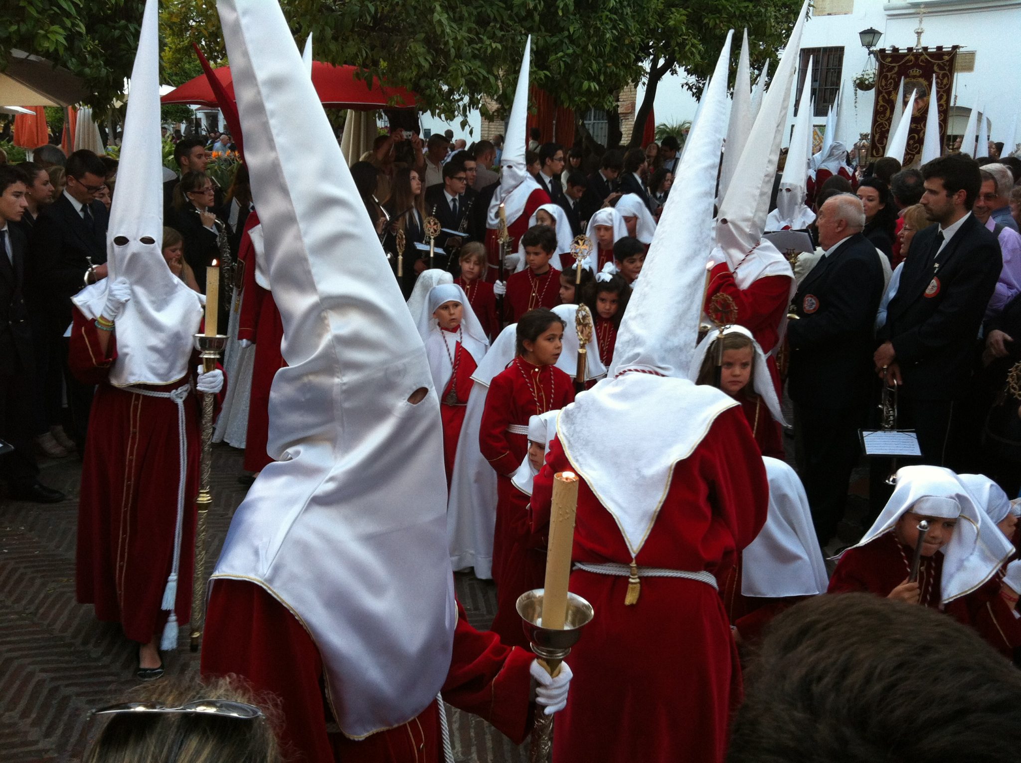 Det er stor rift om å få være med i prosesjonene. Det regnes som en ære å delta enten ved å bære en lykt, et kors, en bispestav eller bare å gå i prosesjonen. Mennene er kledd i heldekkende munkekutter som holdes sammen med et belte av tau. Hodet er dekket av hetter kun med hull for øynene slik at ingen skal kjenne dem igjen når de går i prosesjonen. Deltagerne skal være ydmyke, man skal ikke fremheve sin egen deltagelse ved å vise ansiktet. Noen bærer høye spisse hetter som for oss umiddelbart bringer tankene hen til sydstatenes Ku Klux Klan. Men det er en kortslutning – påskeprosesjonene er en eldgammel tradisjon som kan spores mange hundre år tilbake. De spisse hattene symboliserer syndere og de bærer dem som bot for sine synder. Kvinnene er iført den spanske varianten av bunad – en mantille, det vil si sorte kniplingskjoler og en høy kam gjennom håret som igjen dekkes av et sort kniplingsjal. Vakkert og elegant, og veldig spansk.
