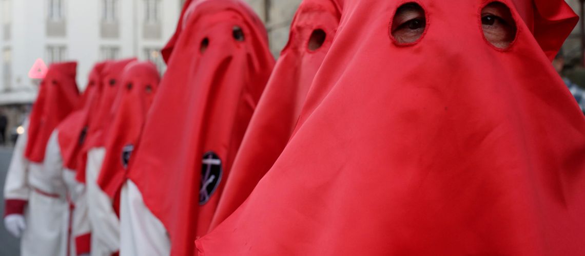 Bildet: Brorskapet «Santisimo Cristo de la Paciencia» marsjerer gjennom Santiago de Compostela 11. april. Foto: Miduel Vidal/Reuters/Scanpix.