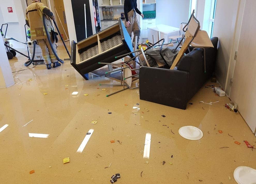 Utlendingsinternatet på Trandum ble påført store materielle skader etter at innsatte gjorde opprør lørdag kveld. Søndag var mannskaper fra brannvesenet i gang med å suge opp vann fra gulvet. Foto: Politiet.