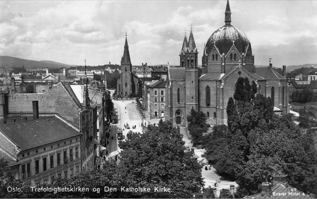 Kirken med spiret er den katolske St. Olavs domkirke (1852-56), og kirken med kuppel Trefoldighetskirken (1850-58). Trikkelinjen i Akersgata er Sagene Ring, som for lengst er nedlagt, selv om deler av skinnene fortsatt kan spores på enkelte steder.
