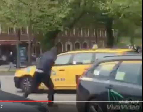 Han begynner å slå sjåføren, for så å dra ham ut av bilen og selv sette seg inn.