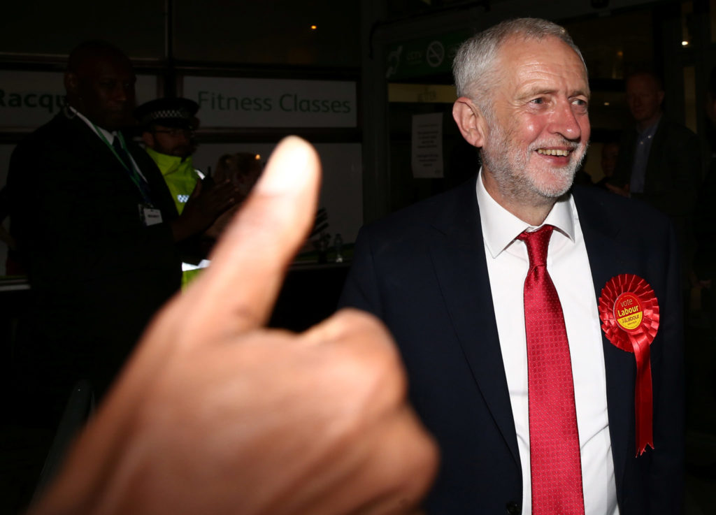 Labour-leder Jeremy Corbyn smilte bredere og bredere i natt. (foto: Reuters/Neil Hall)
