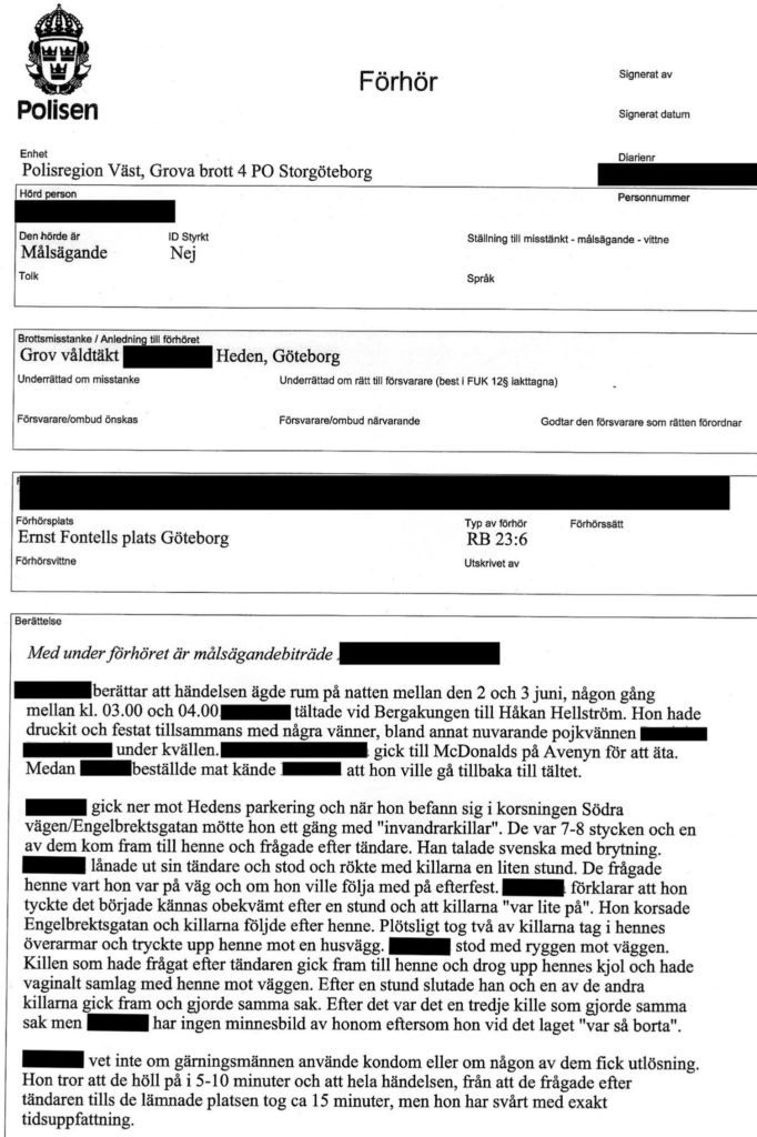 Lamotte skriver det ikke, men i den sladdede versjonen av politiets avhør med jenta han har lagt ut, står det unevnelige: Hun støtte på «ett gäng med ‘invandrarkillar'».