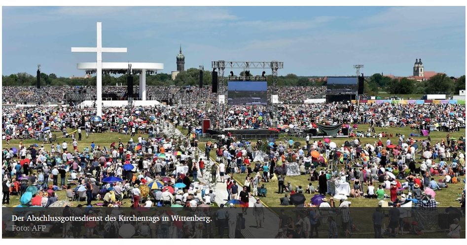 Rundt 120 000 hadde møtt frem til den store avslutningsgudstjenesten i Wittenberg. For meg ble det en nedslående opplevelse med det jeg opplevde som en hippieaktig happening av kunstig «happiness» som hentet fra amerikanske TV-evangelisters show. Men deltakerne synes åpenbart det var fabelaktig og klappet og danset til rock, storband, sving og skrikende gospel. For første gang på svært lenge følte jeg overhodet intet fellesskap med deltakere i en protestantisk gudstjeneste. I stedet følte jeg tristhet blandet med vemmelse. Appellene om kjærlighet og barmhjertighet ble bare hule når de druknet i hatefull retorikk mot høyrepopulisme, rasisme og fremmedfrykt, som var karakteristikker som ble delt ut til alle som ikke delte appellantenes syn om åpne grenser og utslettelse av all nasjonalisme.