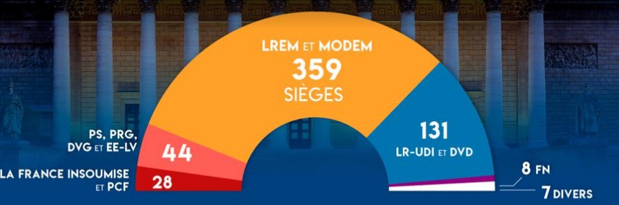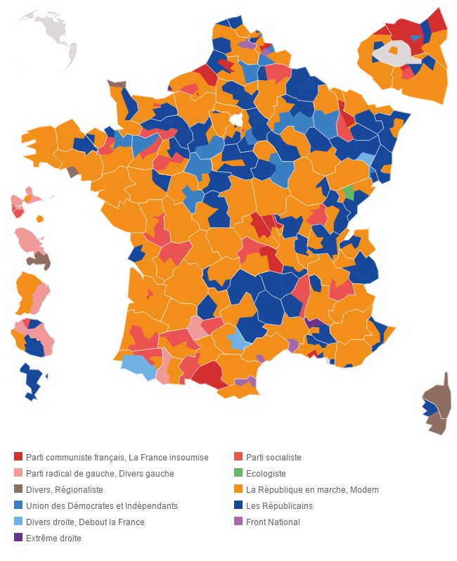 Macrons parti får allikevel ikke så stor andel av stemmene som man hadde forventet, skriver Le Figaro. De siste estimatene gir ham 359 av 577 mandater (62%). En klar majoritet. Kommunistene ligger an til 28 mandater, de konservative til 131 og sosialistene til 44. Front National får 8. Sosialistene hadde 295 mandater før valget og mister altså 251 – hele 85%!