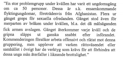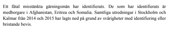 Ifjor publiserte det svenske politiet en rapport om «sexuella ofredanden». Hvem som står bak alle overgrepene problematiseres ikke, men politiet nevner i det minste landsbakgrunn på de gjerningsmennene de greide å identifisere (side 11):