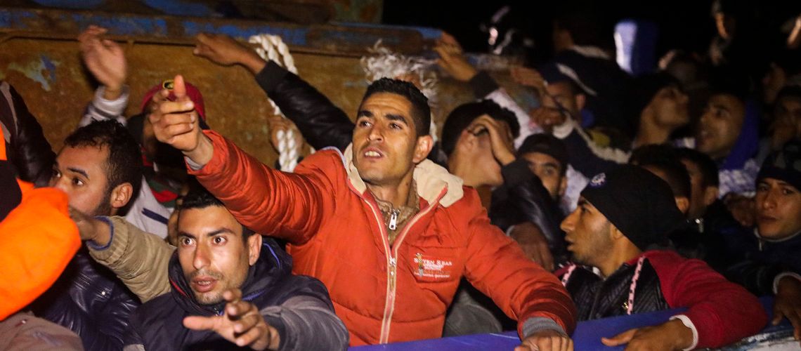 Bare siden sist helg har 12.600 migranter ankommet Italia. Landets 200.000 mottaksplasser er fylt opp. Bildet viser migranter i ferd med å bli plukket opp av Proactiva Open Arms nord av Sabratha i Libya 29. mars i år. (foto: Reuters/Yannis Behrakis)
