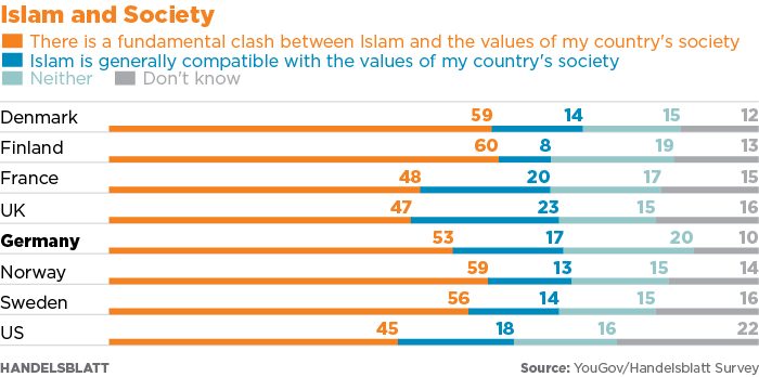 Men det suverent mest oppsiktsvekkende funnet er hvilken avvisende holdning et flertall i alle landene som omfattes av undersøkelsen, har til islam. På spørsmålet om hvorvidt det er et fundamentalt sammenstøt mellom islam og ens eget lands verdier, er de nordiske landene klart mest enig i utsagnet: