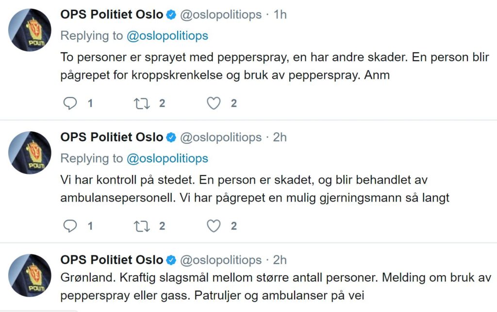 De første meldingene som kom inn til politiet, gikk ut på at det var et kraftig slagsmål mellom et større antall personer, og at det skulle ha blitt brukt pepperspray eller gass.