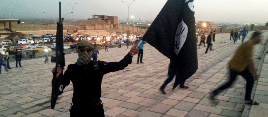 En IS-kriger veiver med IS-flagg og våpen på en gate i Mosul i 2014. (foto: Reuters/Stringer)