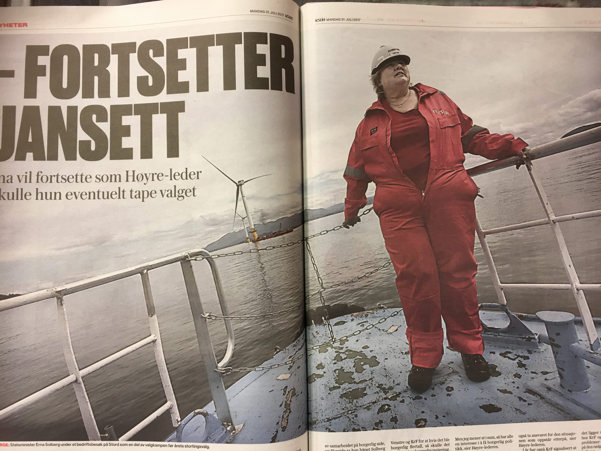 Alle tar poenget: Det er ikke teksten, det er bildet som er hovedsaken. VG driter ut landets statsminister. «Ha! Ha!» kunne vært teksten. – Se hvordan hun ser ut! VG har tatt et bilde i dress for besøk på oljeplattform. VG vet selvsagt at Erna har et omfangsrikt korpus, hun har selv spøkt med det i Stortinget.
